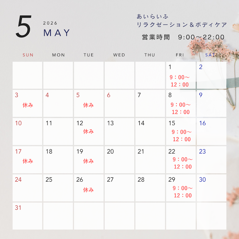 5月営業日につきましてはカレンダーをご確認ください。